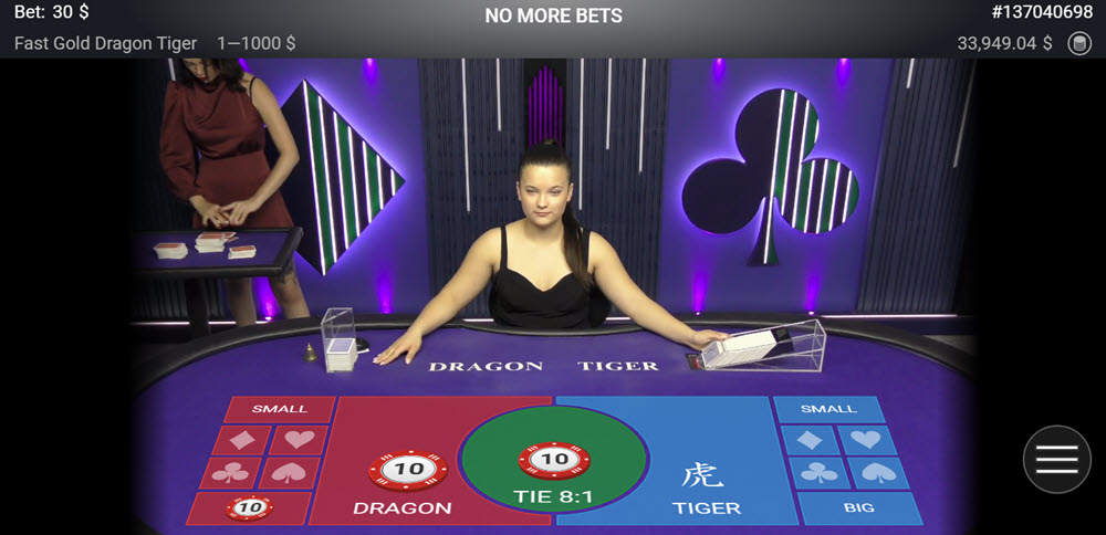 The player bets whether Dragon or Tiger wins. Rules are the same as in Dragon and Tiger. It only depends on first card for “Player” and first card for “Banker” |